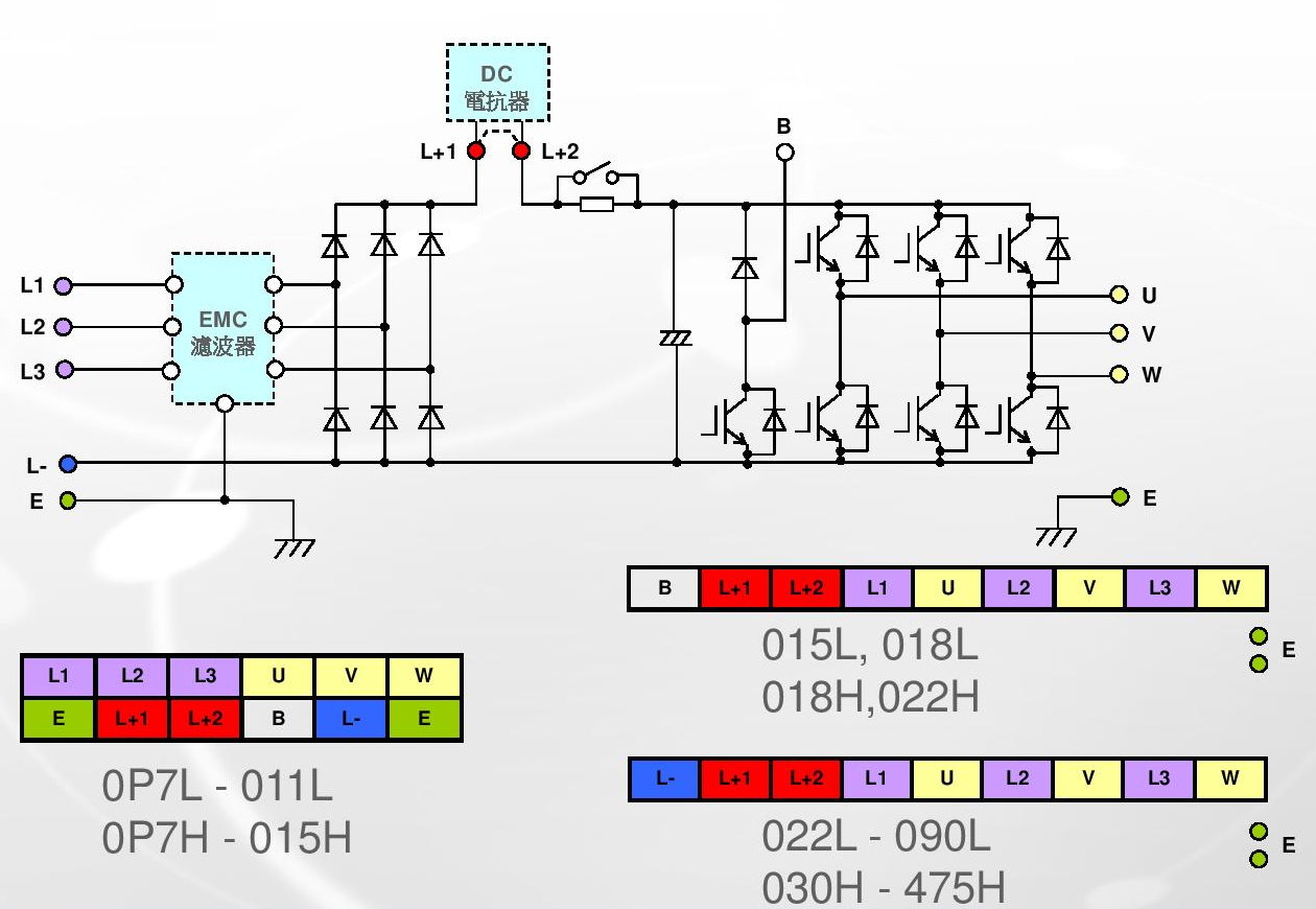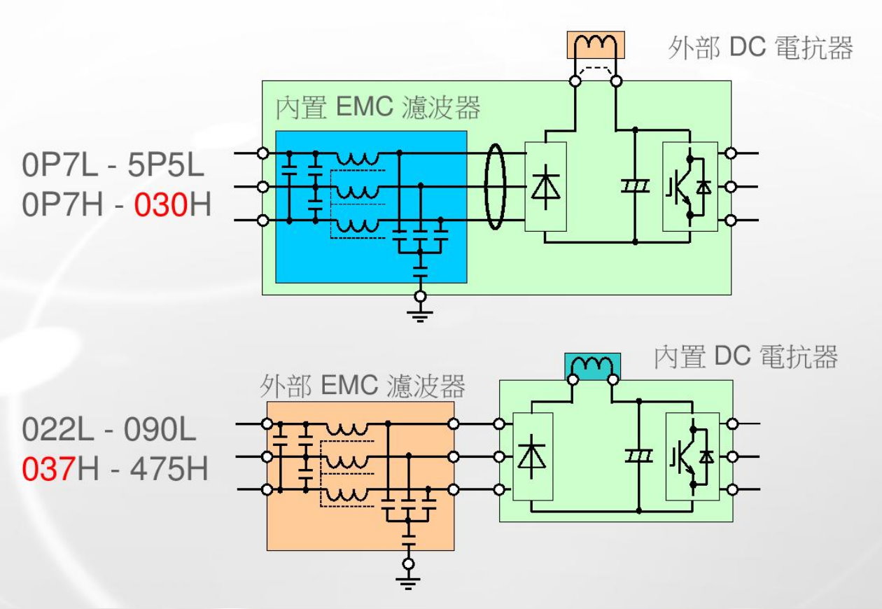 註: 7P5L -018L的EMC濾波器及DC電抗器居為外部安置